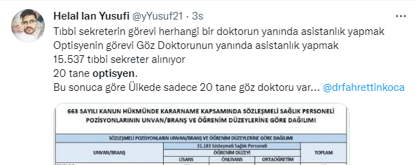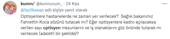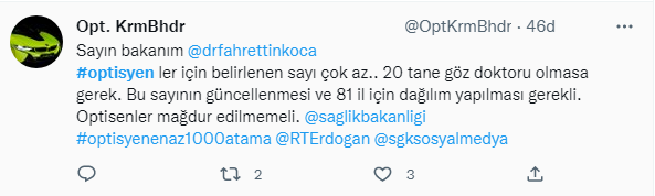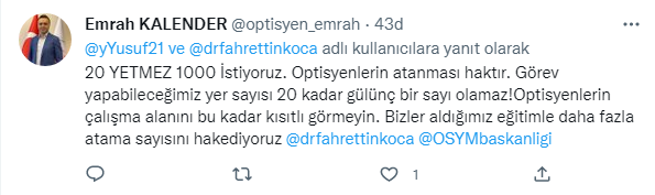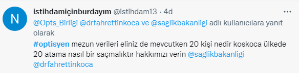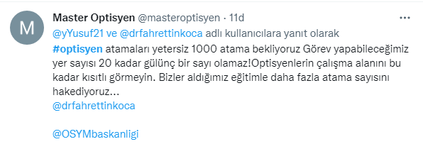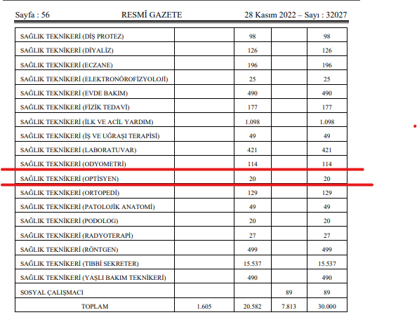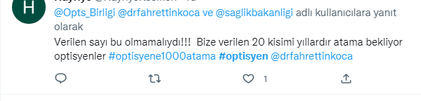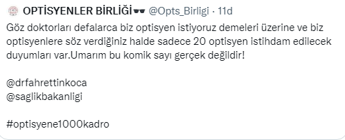 28 Kasım 2022 Tarihli ve 32027 Sayılı Resmî Gazetede Optisyenlerin ilk atama haberi yayınlandı. Ancak sayı optisyenleri tatmin etmedi. Binlerce optisyen atama beklerken sadece 20 kontenjan belirlenmesi tepkiye neden oldu. Optisyenler kararın yayınlanmasından sonra twitter’da binlerce paylaşım yaptı.